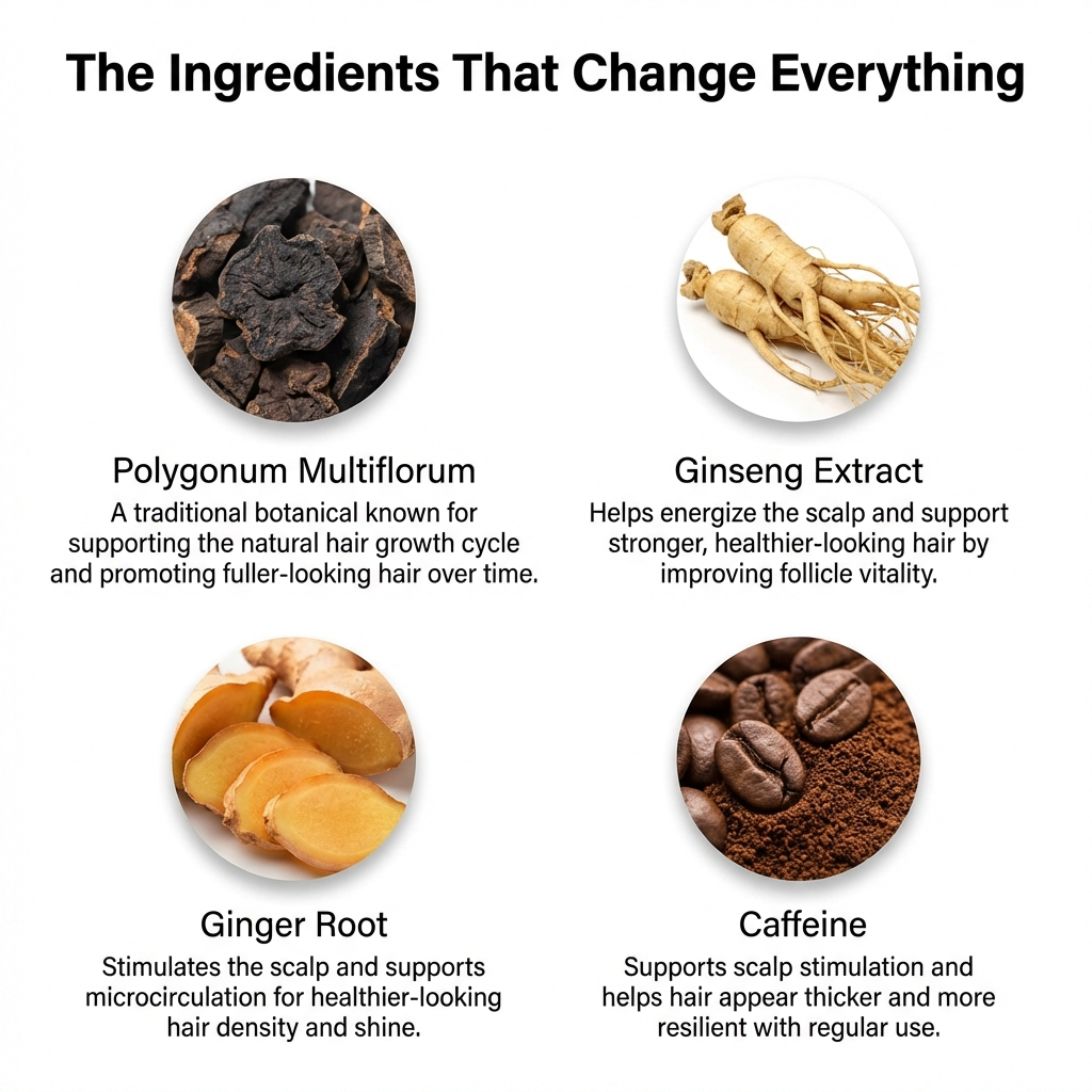 Rosemary helps stimulate circulation to the follicles, while hydrolyzed keratin reinforces each strand so you actually keep the length you grow. Together, they support fuller, healthier, faster-growing hair.